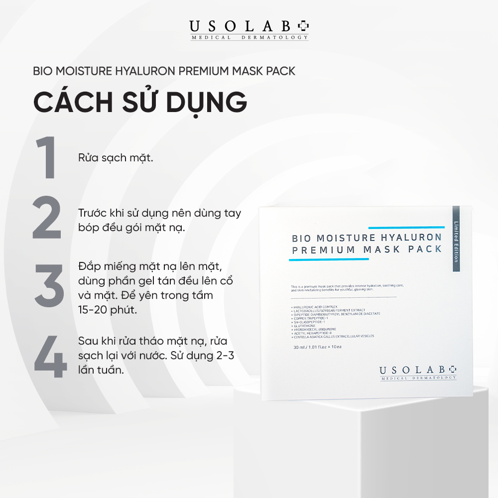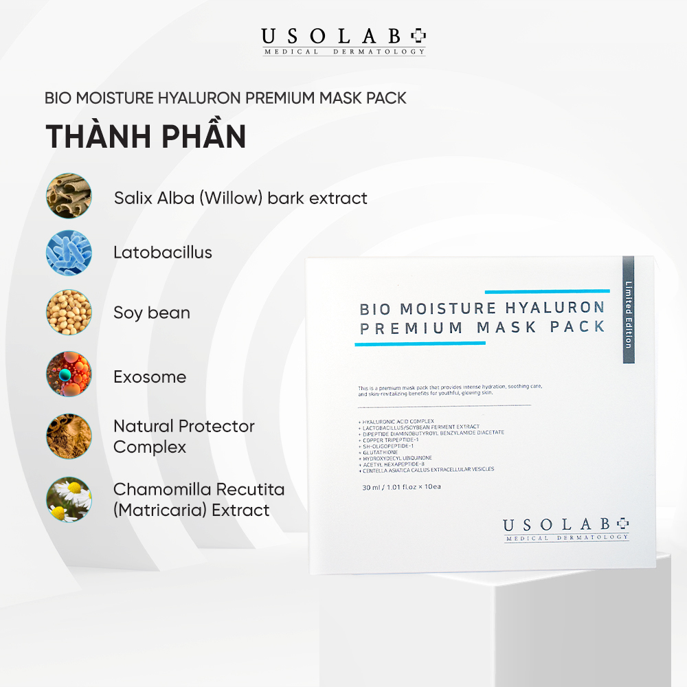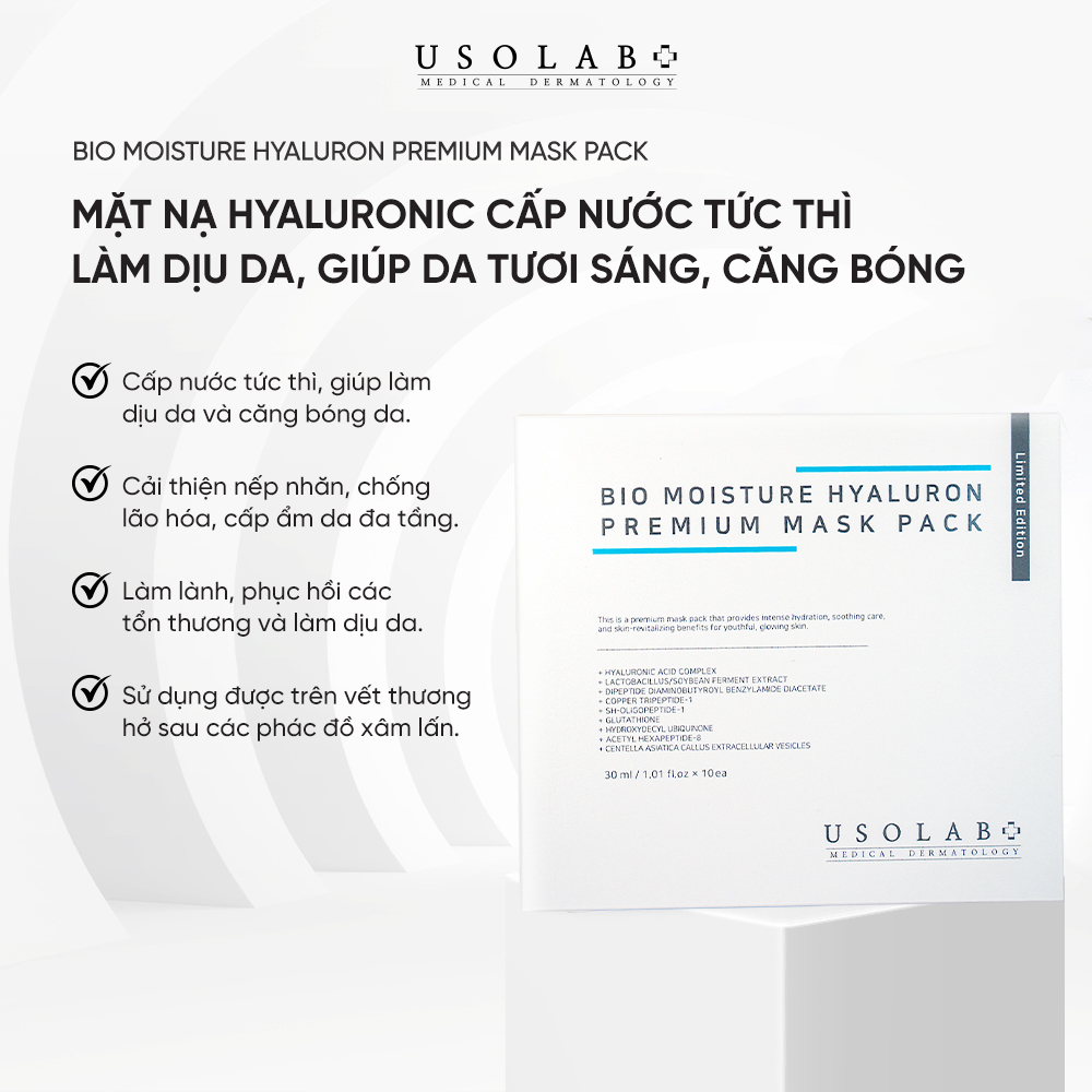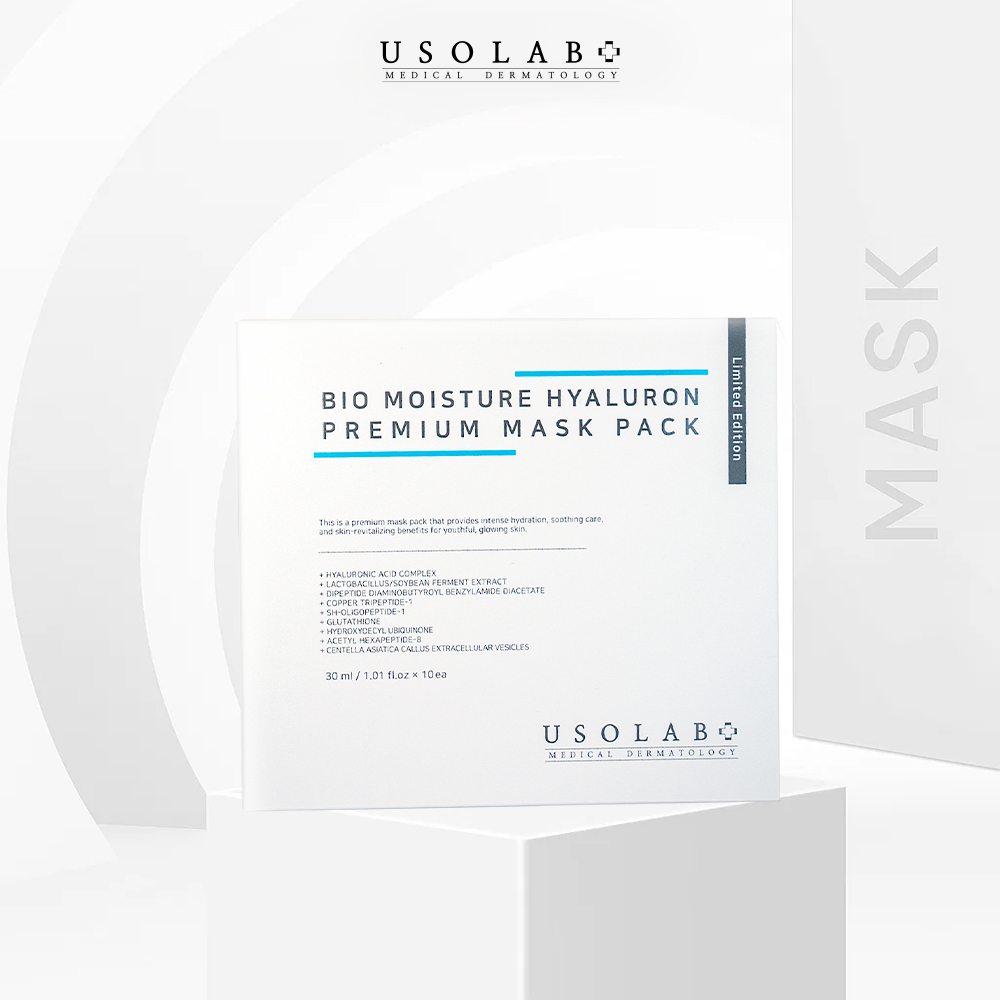 Sản phẩm mặt nạ cấp nước tức thì Bio Moisture Hyaluron Premium Mask Pack là sản phẩm thuộc thương hiệu Usolab, thương hiệu dược mỹ phẩm lâu đời tại Hàn Quốc. Sản phẩm được nhiều chuyên gia da liễu, bác sĩ khuyên dùng. Sản phẩm có tác dụng hiệu quả trong việc cấp nước tức thì, làm dịu da, giúp da tươi sáng và căng bóng.